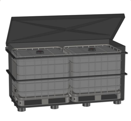 This lockable tank is designed for 2 pcs of 1000L IBC containers. It meets the requirement for 110% containment. There is space for a pump in the collection tank. The bottom is raised with PE pipes, allowing forklift forks/pallet jacks to easily slide under. The lid is curved to allow water runoff.